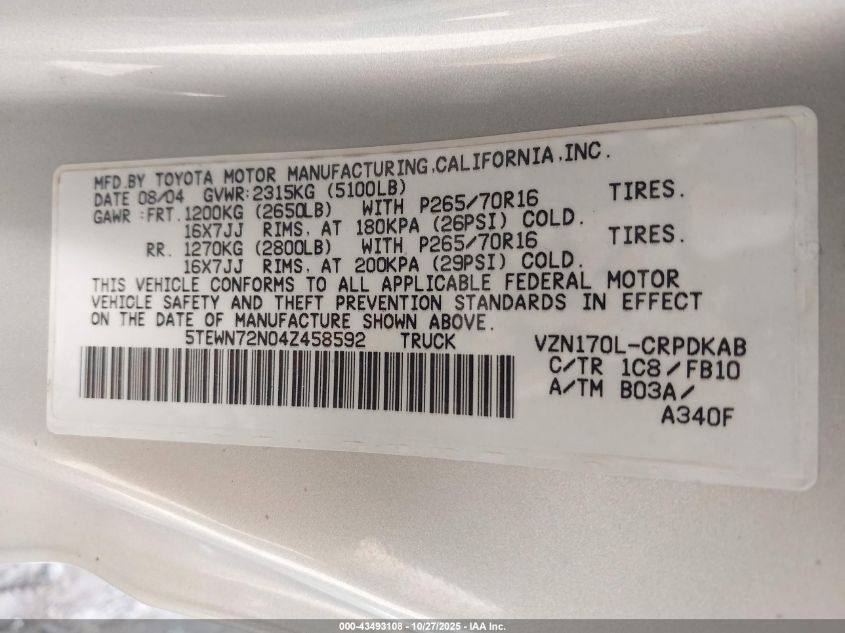 2004 TOYOTA TACOMA BASE V6 for Sale in Inpolis, IN