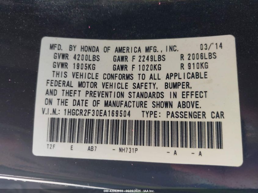 • 1HGCR2F30EA169504