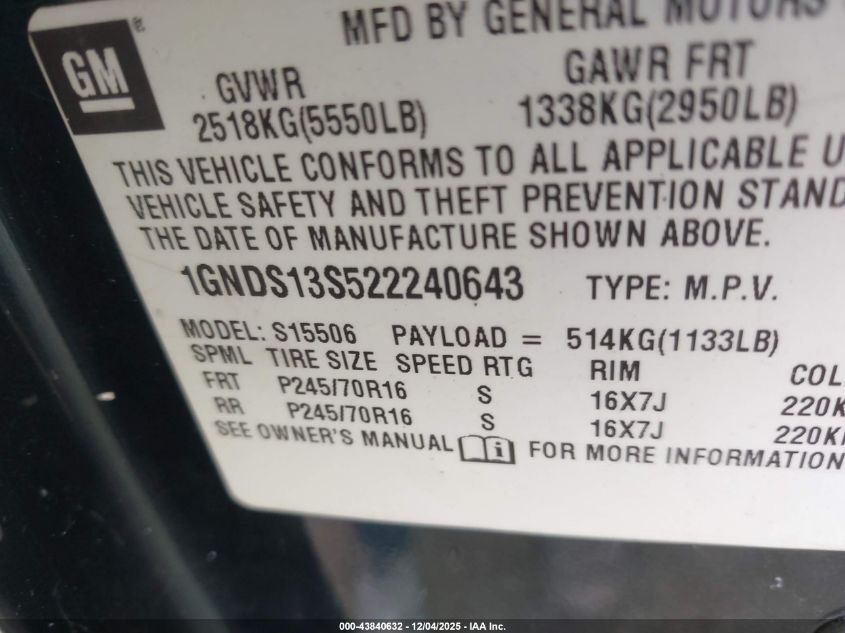 • 1GNDS13S522240643