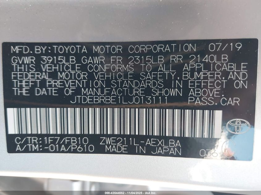 • JTDEBRBE1LJ013111