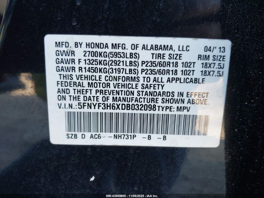 • 5FNYF3H6XDB032098