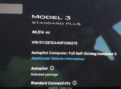 2021 TESLA MODEL 3 STANDARD RANGE PLUS REAR-WHEEL DRIVE for Sale in Electric Vehicle Auctions, None