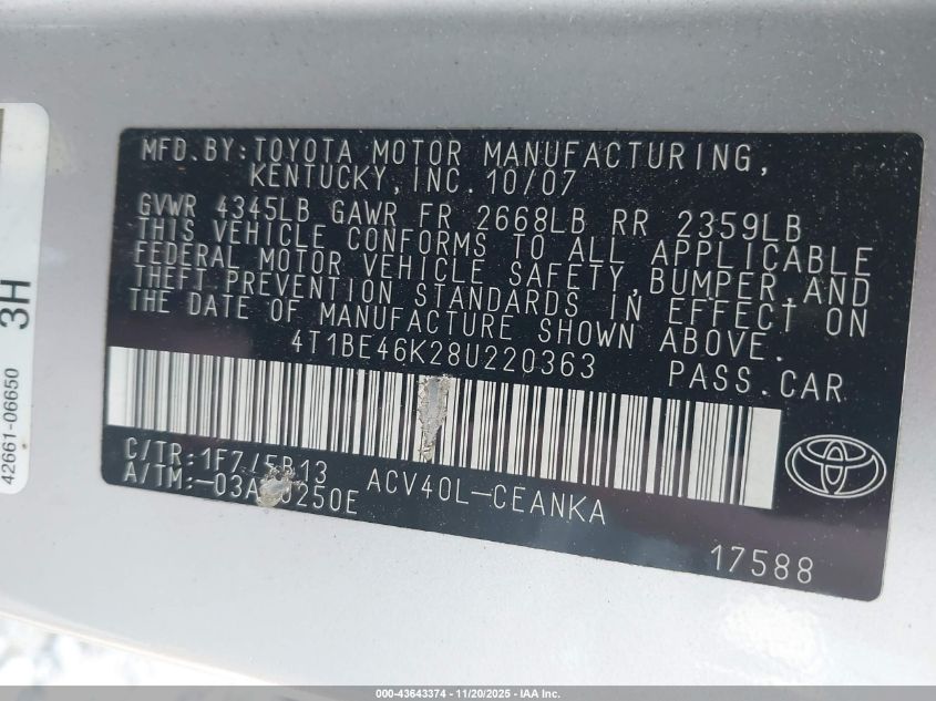 • 4T1BE46K28U220363