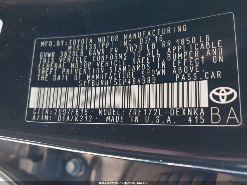 2016 TOYOTA COROLLA LE for Sale in Tifton, GA