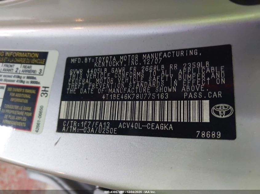 • 4T1BE46K78U775163