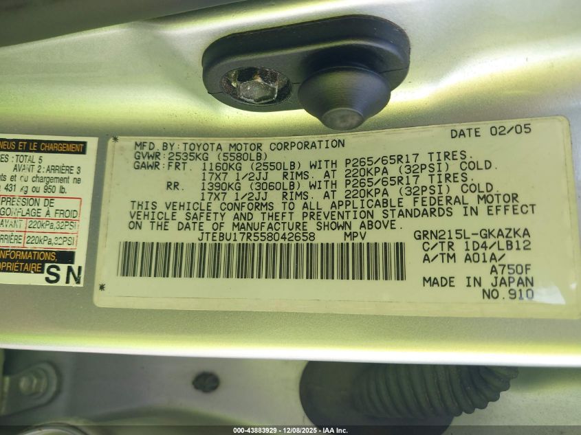 2005 TOYOTA 4RUNNER LIMITED V6 for Sale in Palmetto, FL