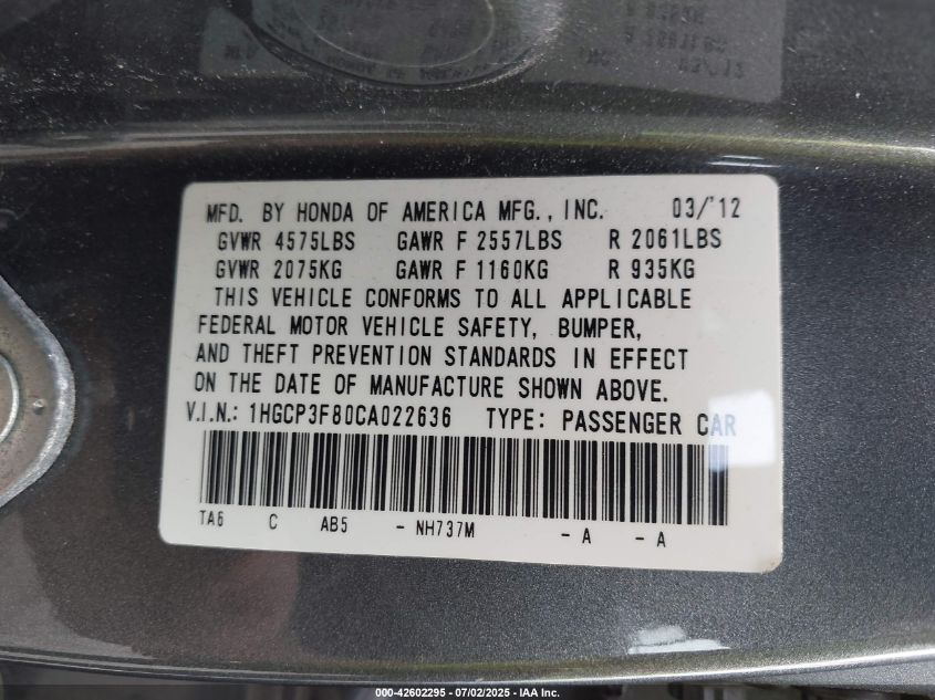 • 1HGCP3F80CA022636