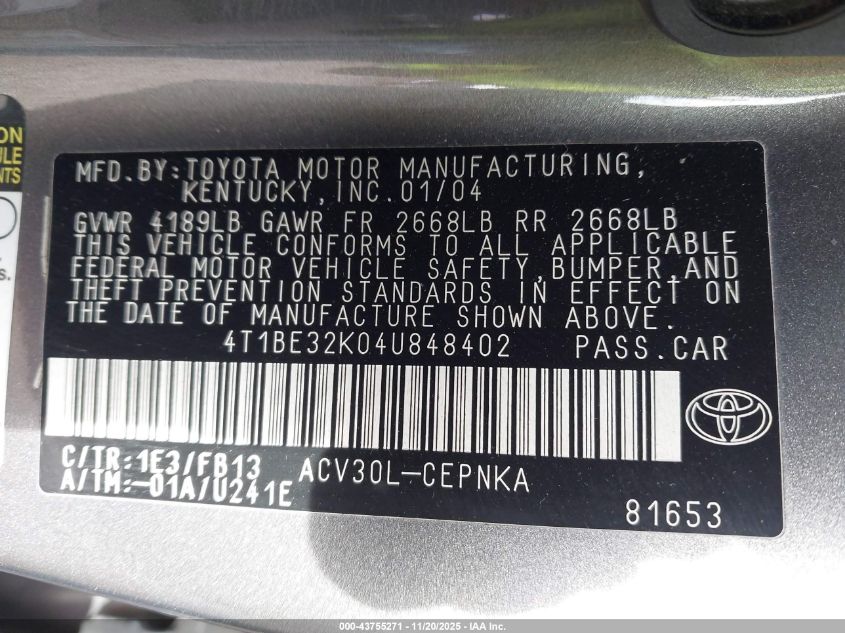 • 4T1BE32K04U848402