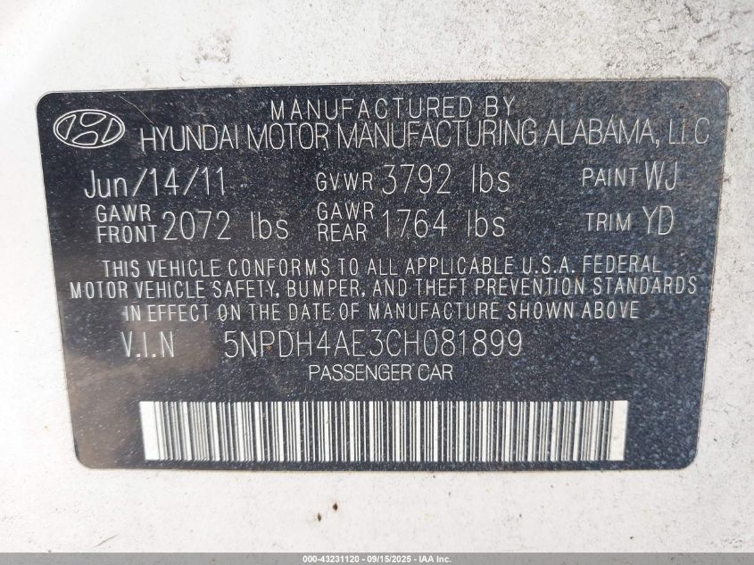 2012 HYUNDAI ELANTRA LIMITED for Sale in York Springs, PA