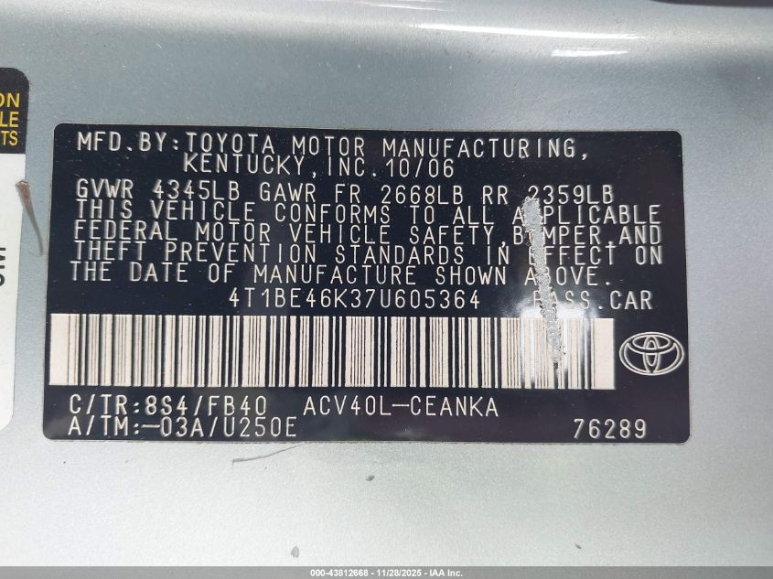 • 4T1BE46K37U605364