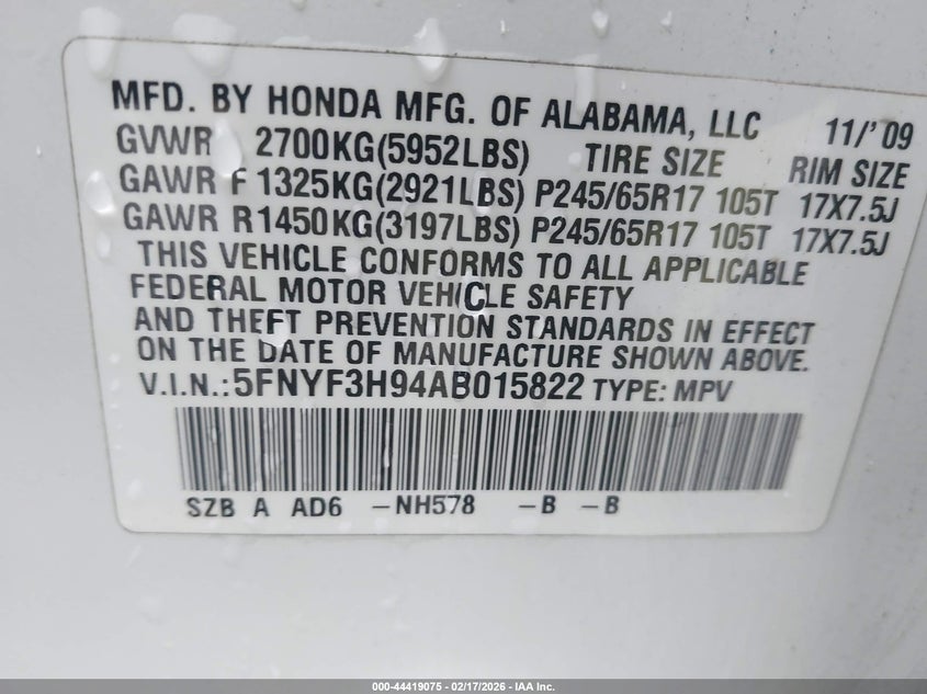 • 5FNYF3H94AB015822