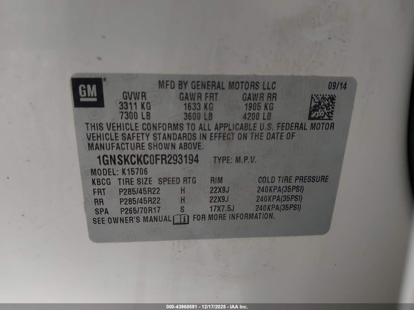 • 1GNSKCKC0FR293194