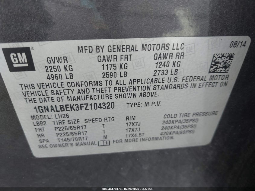 • 1GNALBEK3FZ104320