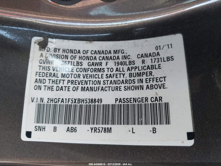 • 2HGFA1F5XBH538849