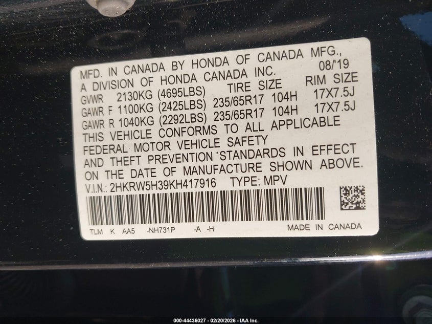 • 2HKRW5H39KH417916