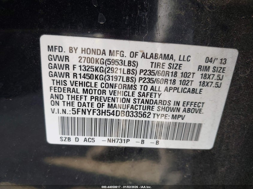 • 5FNYF3H54DB033562