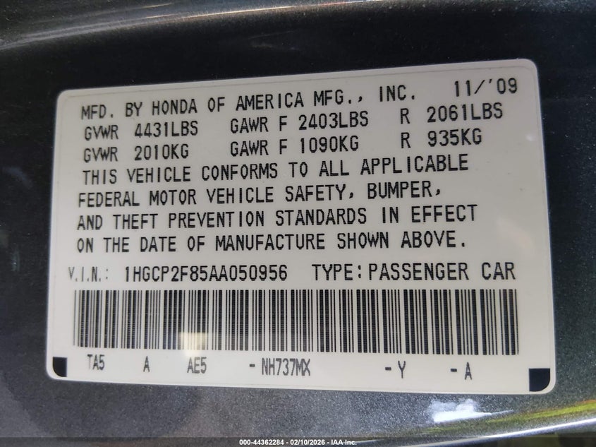 • 1HGCP2F85AA050956