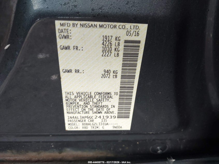 2016 NISSAN ALTIMA 2.5/2.5 S/2.5 SL/2.5 SR/2.5 SV for Sale in Lorain, OH