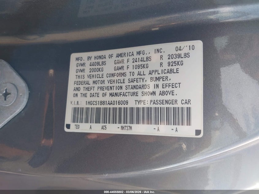 • 1HGCS1B81AA016009