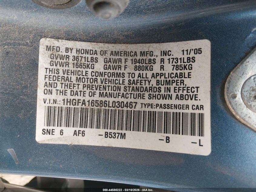 • 1HGFA16586L030467