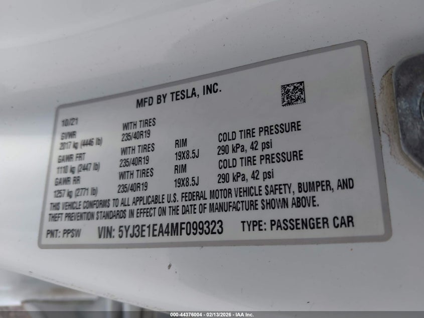 2021 TESLA MODEL 3 STANDARD RANGE PLUS REAR-WHEEL DRIVE for Sale in Electric Vehicle Auctions, None
