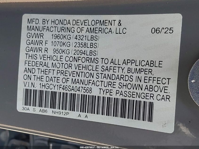 • 1HGCY1F46SA047568