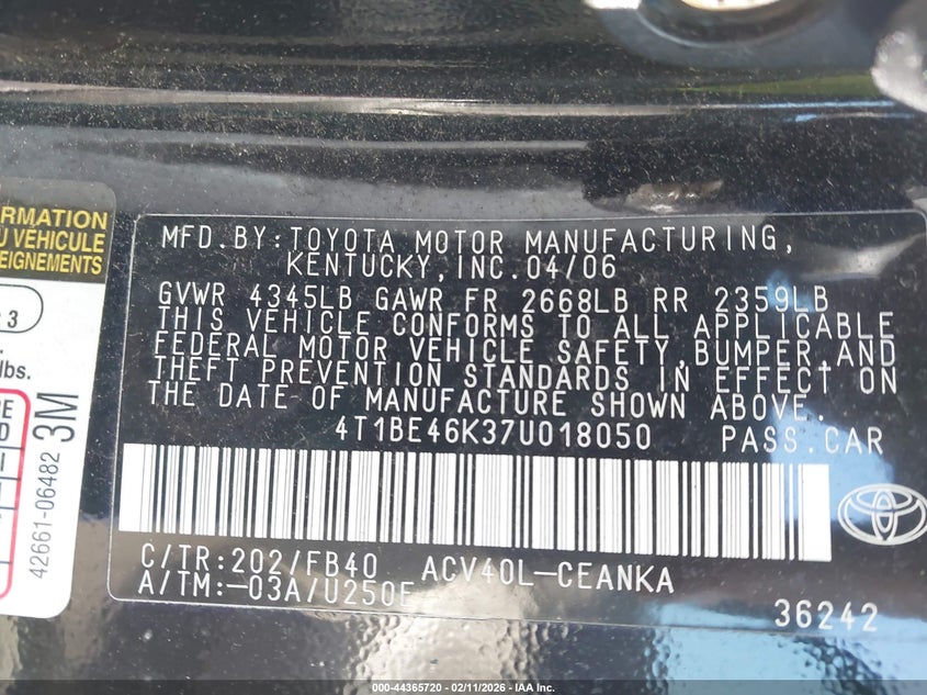 • 4T1BE46K37U018050