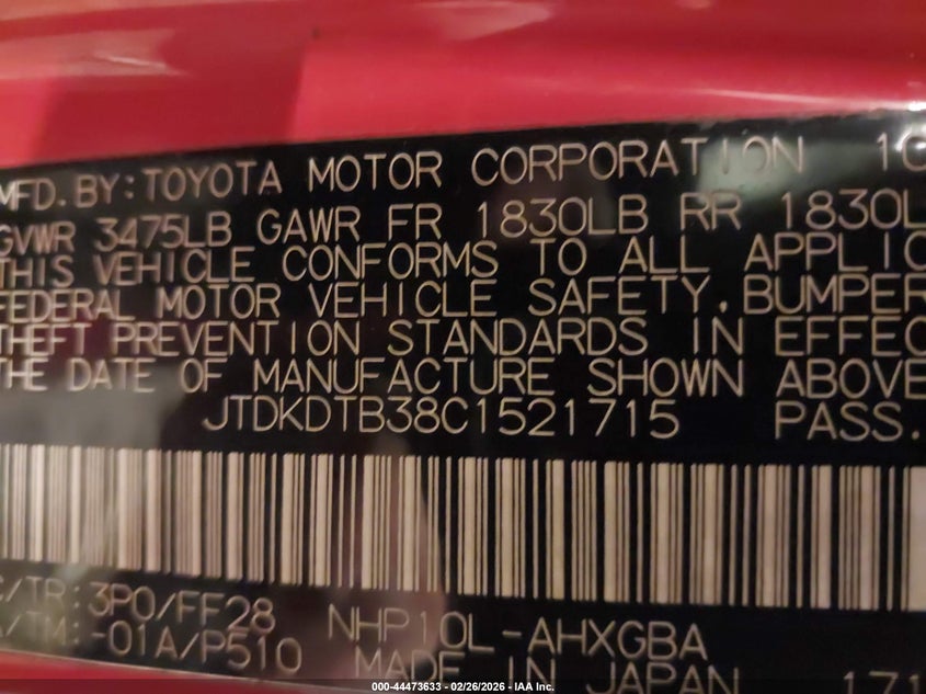 • JTDKDTB38C1521715