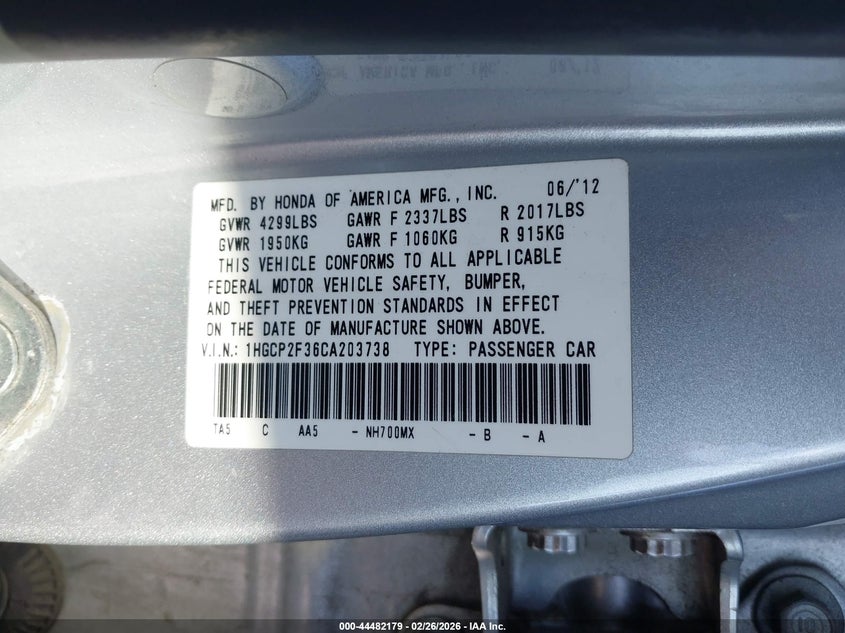 • 1HGCP2F36CA203738