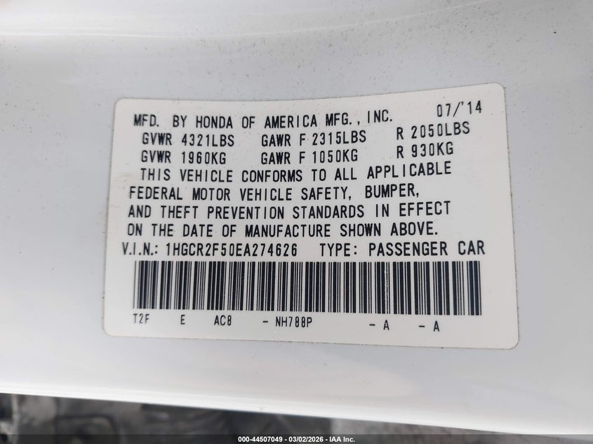 • 1HGCR2F50EA274626