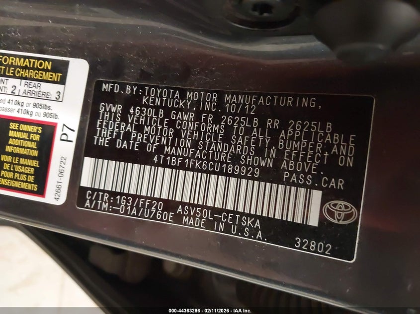 • 4T1BF1FK6CU189929