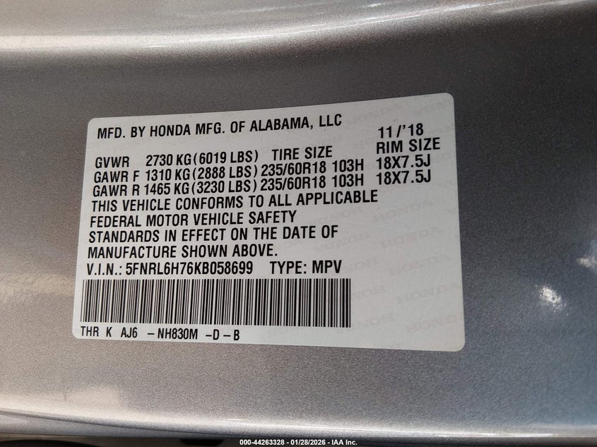 • 5FNRL6H76KB058699