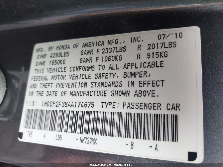 • 1HGCP2F38AA174675