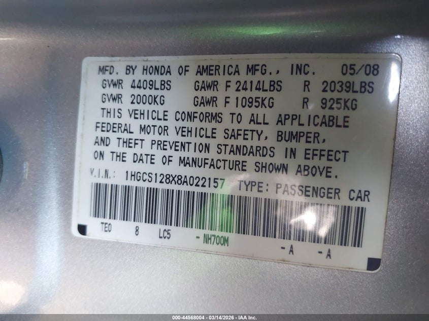 • 1HGCS128X8A022157