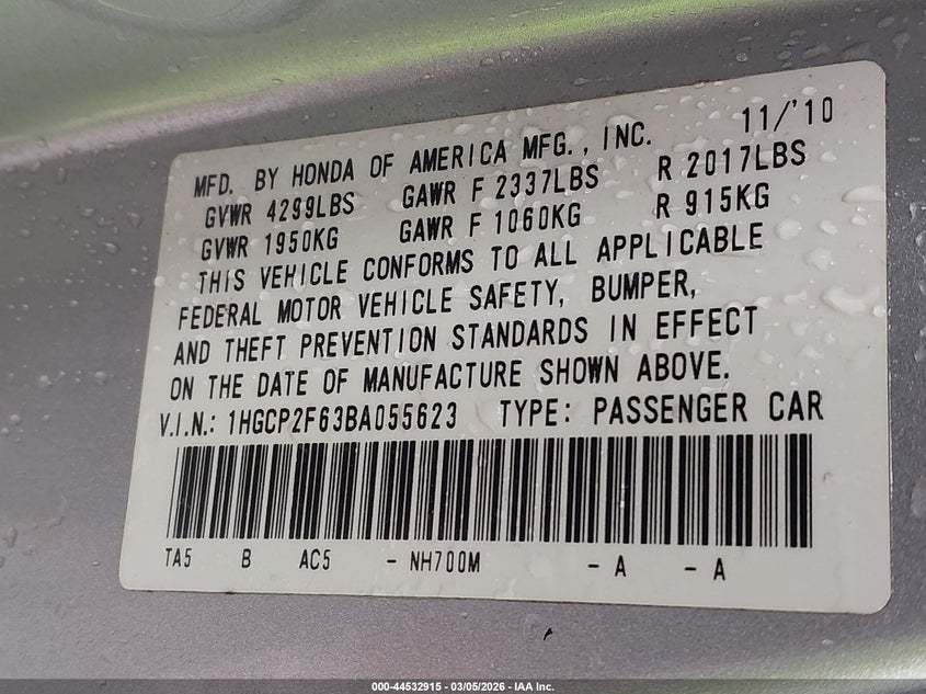 • 1HGCP2F63BA055623