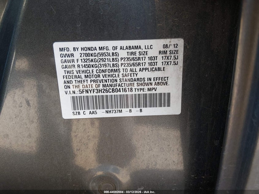 • 5FNYF3H26CB041618