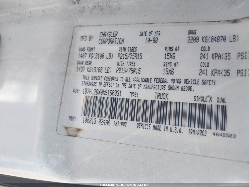 • 1B7FL26X0XS160931