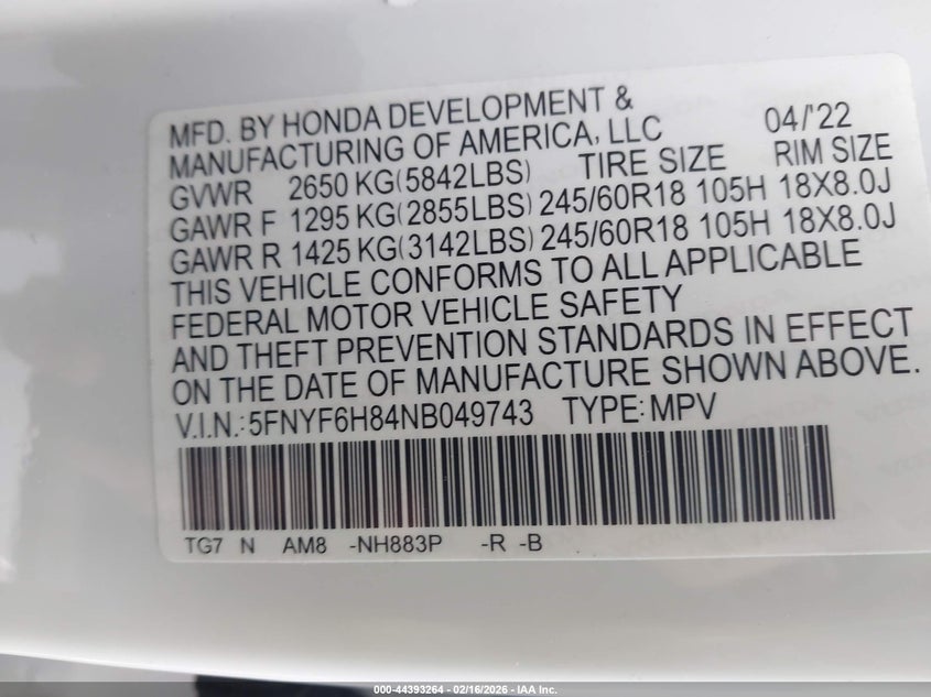 • 5FNYF6H84NB049743