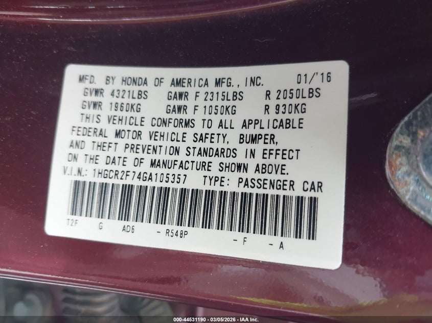 • 1HGCR2F74GA105357