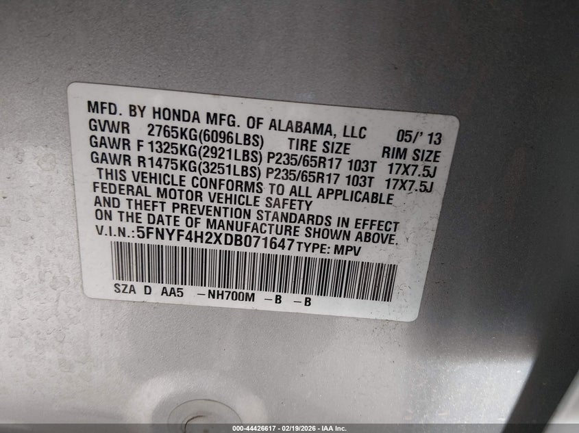 • 5FNYF4H2XDB071647
