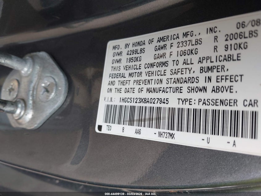• 1HGCS123X8A027945