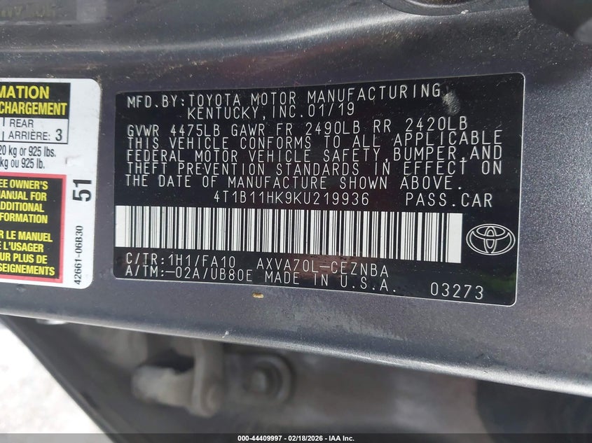 • 4T1B11HK9KU219936