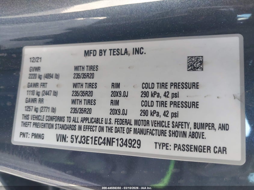 2022 TESLA MODEL 3 PERFORMANCE DUAL MOTOR ALL-WHEEL DRIVE for Sale in Electric Vehicle Auctions, None