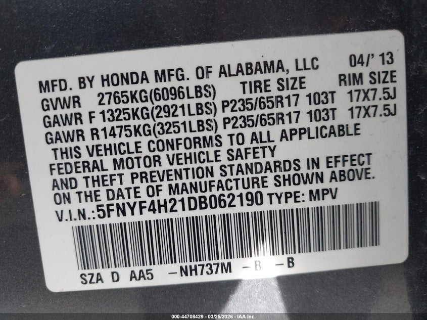 • 5FNYF4H21DB062190