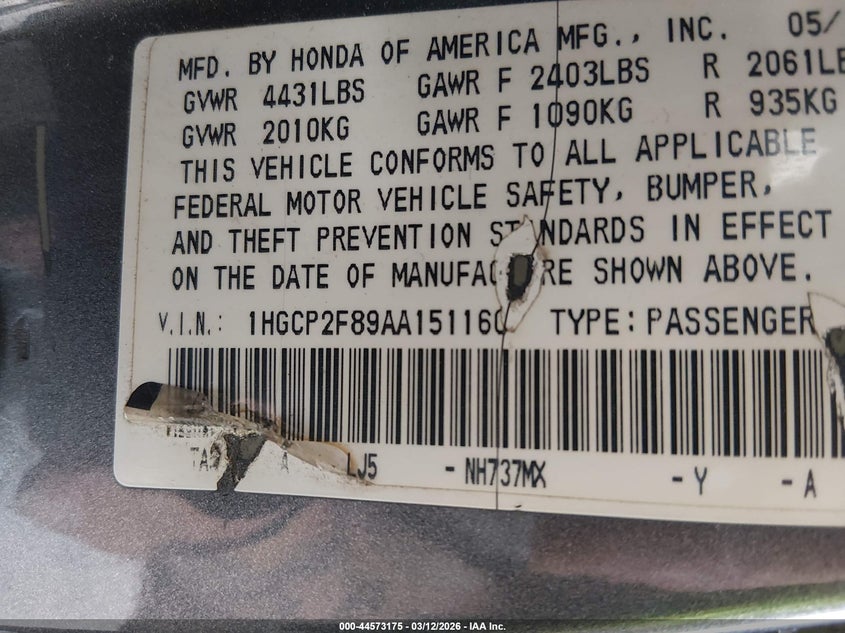 • 1HGCP2F89AA151160