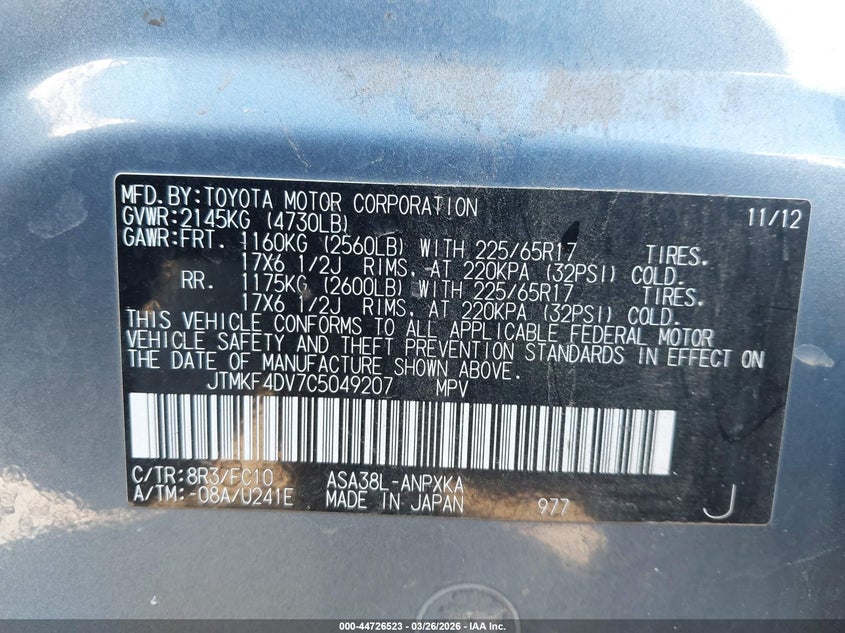 • JTMKF4DV7C5049207