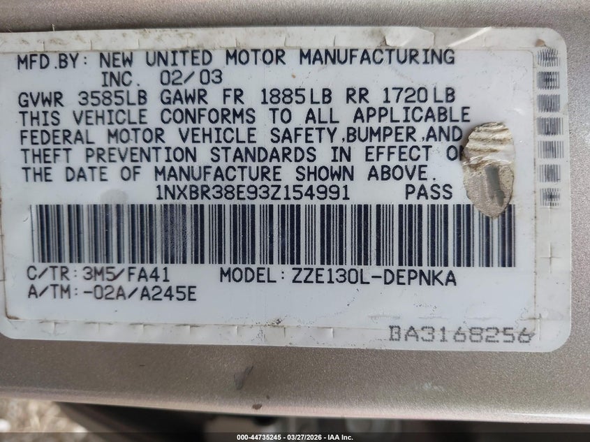 • 1NXBR38E93Z154991