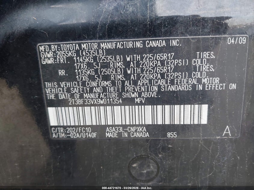 • 2T3BF33VX9W011354