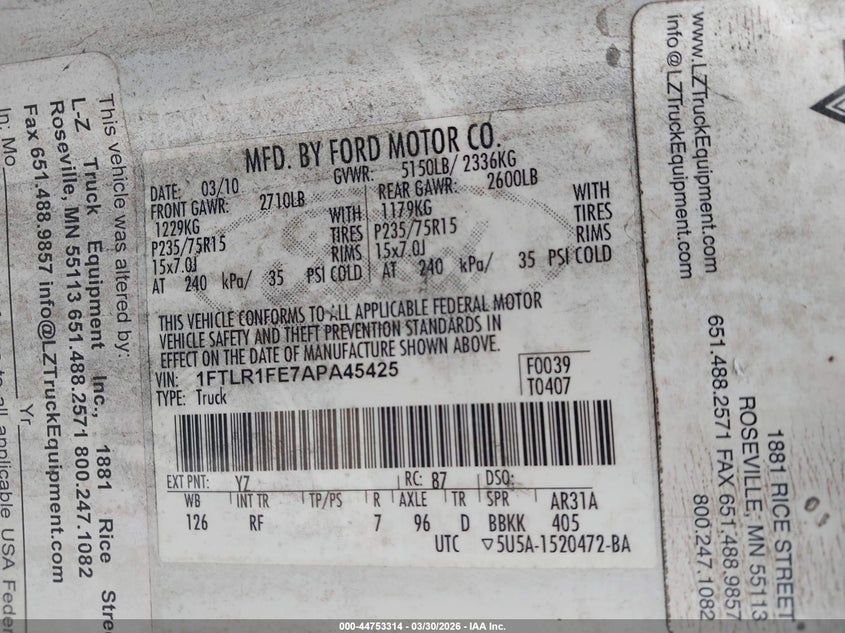 • 1FTLR1FE7APA45425