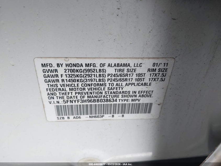 • 5FNYF3H96BB038634